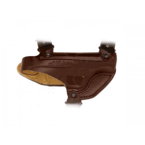 Кобура, предназначенная для пистолета Макарова, выполнена из кожи. Два ушка, расположенных на корпусе, делают ее идеальной для плечевого способа ношения. Такое строение позволяет легко крепиться к подвесной системе с расширенными передними ремнями и фиксацией к поясу.