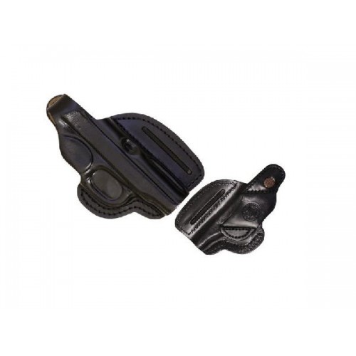 Кобура предназначена для ношения на левой стороне пояса под правую руку. Выполненная из натуральной кожи модель плотно фиксирует оружие внутри за счет формовки, копирующей форму пистолета, и хлястика на кнопке. Ухо и шлевка помогают ей плотно прилегать к ремню.