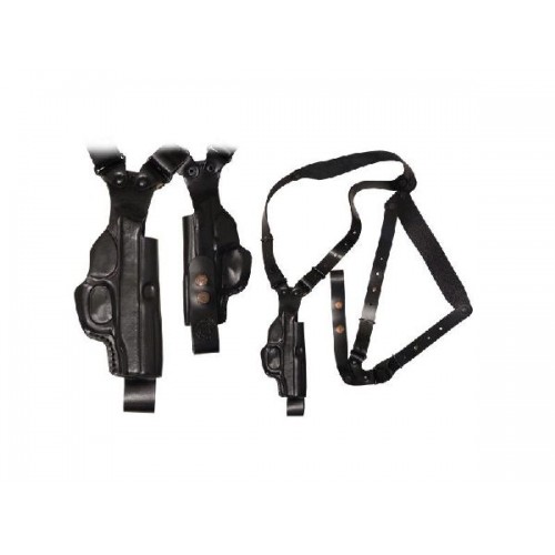 Наплечная кобура подходит для вертикального ношения оружия. Пистолет надежно помещается внутрь, фиксируется благодаря застежке с кнопкой и точной формовке. В комплект также входит подвесная система с ремешками и боковой застежкой.