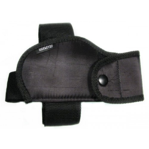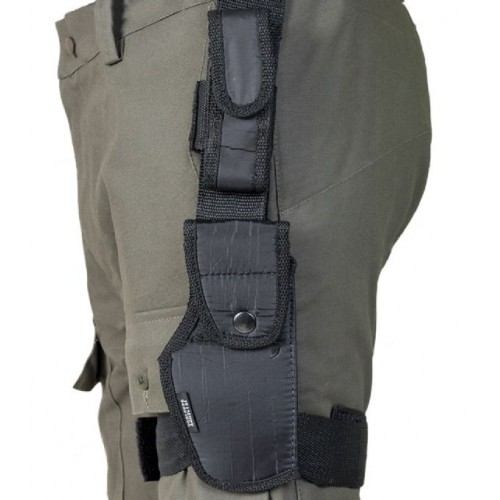 Кобура, изготовленная для ношения пистолета Макарова, выполнена из синтетической ткани. Она носится на бедре, пристегнутая надежным креплением, которое обхватывает ногу. Помещенный внутрь пистолет, застегивающийся на ремешок с кнопкой, располагается вертикально.