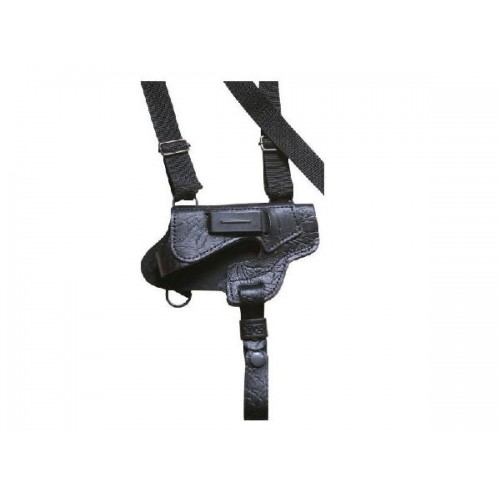 Кобура универсального черного цвета выполнена из износостойкой кожи. Она оснащена ушками для крепления подвесной системы, а также клипсой для фиксации к ремню. Застежка с кнопкой, а также точная формовка позволяют плотно удерживать пистолет в кобуре.