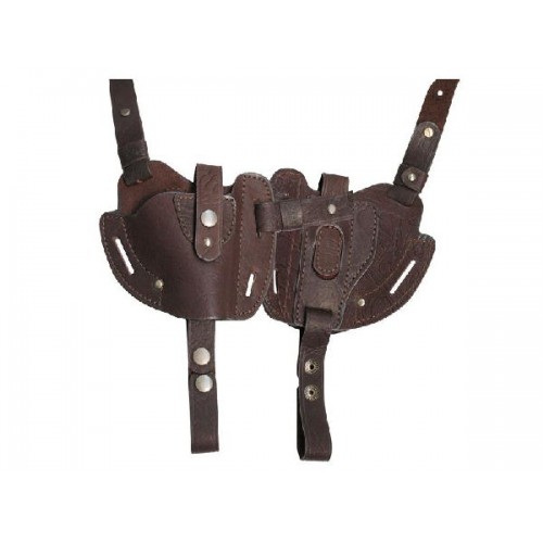 Кобура универсального назначения выполнена из коричневой кожи. Благодаря точной формовке пистолет уютно погружается внутрь. В качестве застежки используется ремешок с кнопкой. С помощью подвесной системы кобуру можно носить на плече.