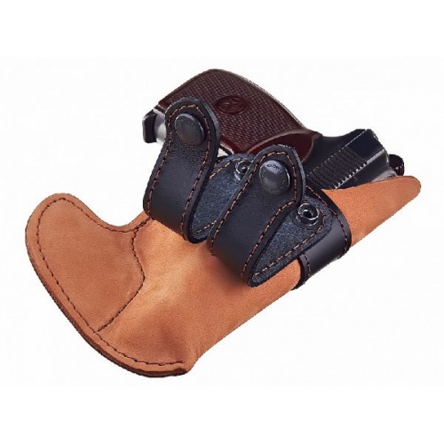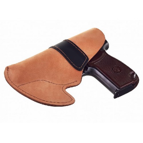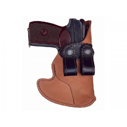 Кобура располагается в брюках и крепится через шлевки за брючный ремень.