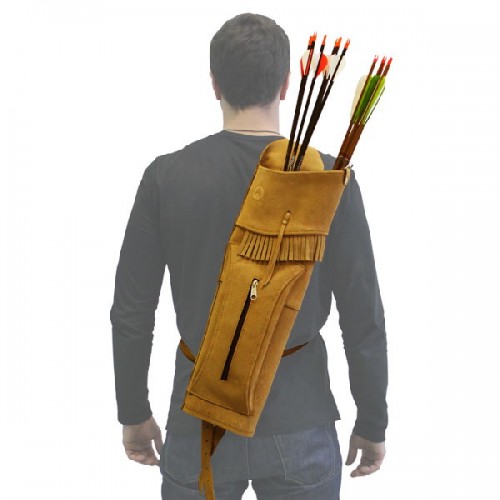 Заспинный колчан для традиционной стрельбы, изготовленный из замши, с регулируемыми лямками, жестким дном, с двумя отделениями для стрел и карманом, застегивающимся на «молнию». Подходит для любых лучных стрел.