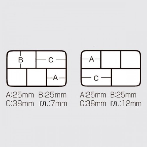 | Дополнительная информация: | внутренние размеры ячеек коробки: маленькие отделения 2,5x2,5 см, большие отделения - 3,8x2,5 см |