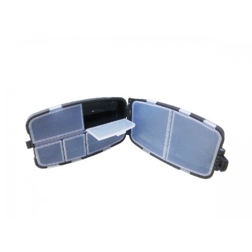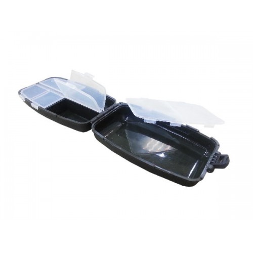 Двухстворчатая многосекционная коробочка для крючков и других мелочей. Каждое отделение створки снабжено защитной прозрачной крышкой.