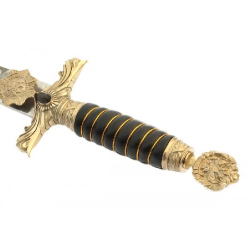 Кожаная рукоять орудия имеет изображение ордена Андрея Первозванного, наконечник из латуни в виде двуглавого орла. На клинке выгравированы слова «За веру и верность». Ножны украшены изображением лаврового венка и двуглавого орла.