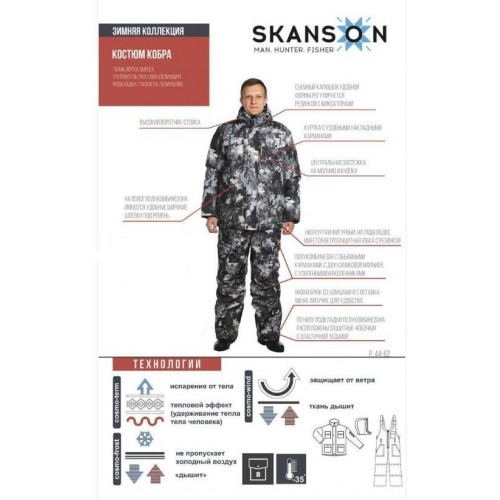 Универсальный костюм "Кобра" изготовлен из современных материалов: ткань верха - Duplex , утеплитель куртки - пух (100% полиэфир), полукомбинезона - синтепон 200 гр/м2, подкладка - таффета, Polarfleece . Костюм состоит из куртки и полукомбинезона.