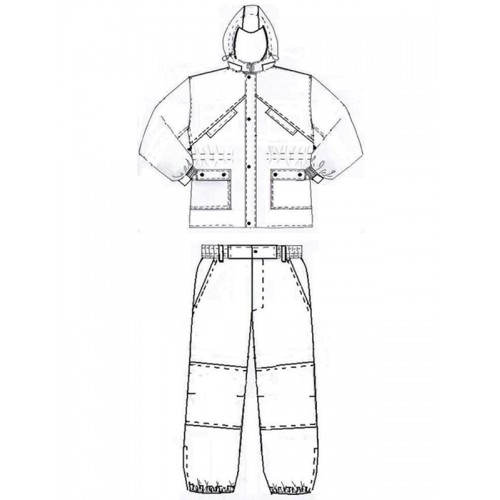 Демисезонный костюм, состоящий из куртки и брюк. Пристегивающийся на молнию капюшон с регулировкой лицевой части по высоте резиновым шнуром. Центральная застежка на двухзамковую фронтальную молнию, закрытую ветрозащитной планкой на кнопках. Под проймами вентиляционные вставки с сеткой на молнии. Низ и талия куртки с регулировкой по ширине резиновым шнуром. Застежка брюк на молнию, по низу боковых швов молния с пуфтой для регулировки ширины брюк. Количество карманов - 6.
