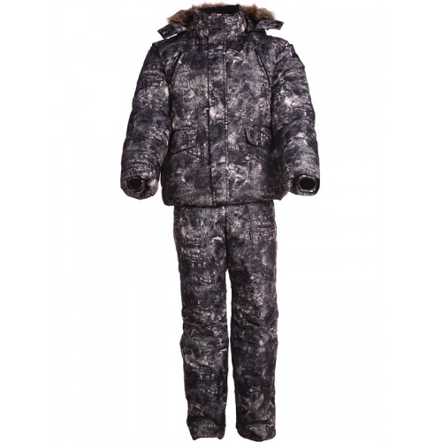 Утепленный костюм с укороченной курткой на резинке. Предназначен для холодного времени года, состоит из куртки и полукомбинезона. Произведен с использованием современных технологий. Куртка на молнии и кнопках, с большими теплыми нагрудными карманами на молнии. Высокий, теплый комбинированный флисовый воротник-стойка. Съемный утепленный капюшон с опушкой на кнопках. Рукава на манжетах с эластичной тесьмой, усилены в области локтя накладками. Низ куртки на притачном поясе с эластичной тесьмой. Полукомбинезон с объемными карманами, с двухзамковой молнией, на бретелях с карабинами и эластичными вставками, с усиленными наколенниками и накладками на задних половинках. Низ брюк со шлицами и с вставками на липучке для удобства. На поясе полукомбинезона удобные широкие шлевки под ремень. По низу подкладки полукомбинезона расположены защитные «юбочки» с эластичной тесьмой. Количество карманов - 10. Ткань не впитывает влагу и имеет теплоизолирующие свойства.