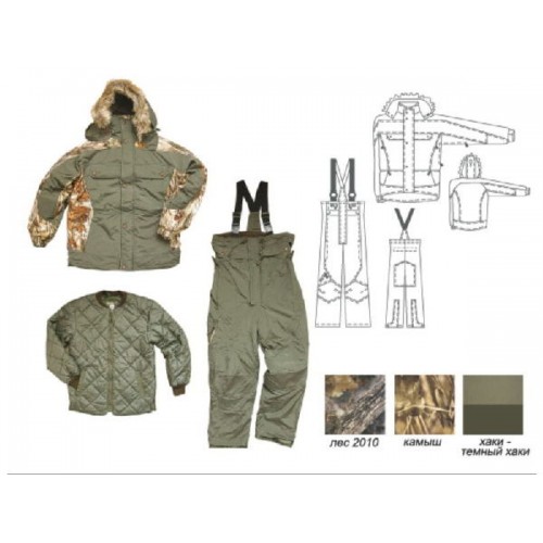 Универсальный костюм "3 в 1". Используется для рыбалки и охоты в холодную погоду. Рекомендуется для носки при температуре -10° С до -45° С. Состоит из куртки и полукомбинезона. Удлиненная куртка застегивается на молнию, защищенную ветрозащитной планкой. Шесть карманов на молнии защищены клапанами на кнопках. Высокий воротник-стойка предотвращает задувание ветра, а также попадания снега и дождя под низ куртки. В боковых швах расположены вентиляционные отверстия на молниях. Удлиненная спинка обеспечивает комфорт в положении сидя. Полукомбинезон имеет объемный крой в области колен и дополнительное усиление пенополиэтиленом. По низу брюк пришиты молнии, закрытые сапожками - планками с регулировкой объема.
