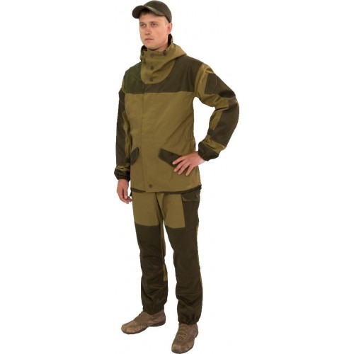 Мужской костюм для туризма, охоты и рыбалки. Отличается прочностью и надежностью, не сковывает движений и не продувается ветром, при этом хорошо дышит и выдерживает воздействие влаги. Наиболее подверженные внешним воздействиям места костюма усилены вторым слоем материала, это - области плеч, локтей, живота, пятой точки, коленей и низа брюк.
