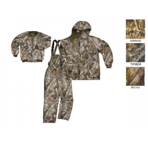 Утепленный костюм для рыбалки и охоты. Состоит из куртки-ветровки, утепленной куртки-пристежки и утепленного полукомбинезона. Все швы куртки проклеены. Верхняя часть на подкладе из сетки. Карманы закрываются на клапаны и планки. Центральная застежка на молнии закрывается ветрозащитной планкой. На куртке есть съемный капюшон с меховой отделкой. Манжеты регулируются по объему. Куртка-пристежка - на молнии. Полукомбинезон регулируется по длине эластичными бретелями. На внутренних гетрах по низу пришита антискользящая резина. На подкладу штанин есть "юбочка" для защиты от снега.