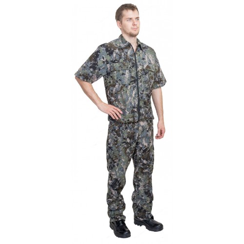 Облегченный костюм Темп отлично подойдет для охоты или рыбалки в жару. Состоит из двух частей: укороченной куртки и брюк. Сшит из легкой смесовой ткани.