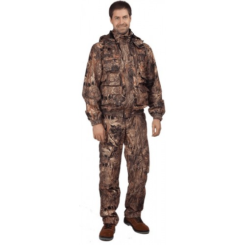 Облегченный костюм "Тростник" предназначен для времяпрепровождения за городом летом. Изготовлен из легкой ткани, а наиболее уязвимые места защищены влагостойкой тканью. Состоит из куртки и брюк. Удлиненная куртка застегивается на молнию. Несъемный капюшон регулируется по объему в двух плоскостях. Козырек способствует дополнительной защите от солнца и дождя. Снаружи есть два объемных кармана с клапанами. По низу рукавов пришиты манжеты на резинке, плотно облегающие руку. Объем брюк на талии регулируется резинкой. Пояс застегивается на надежную пуговицу. Есть шлевки под широкий ремень. Область коленей и низ брюк выполнены из усиленного материала.