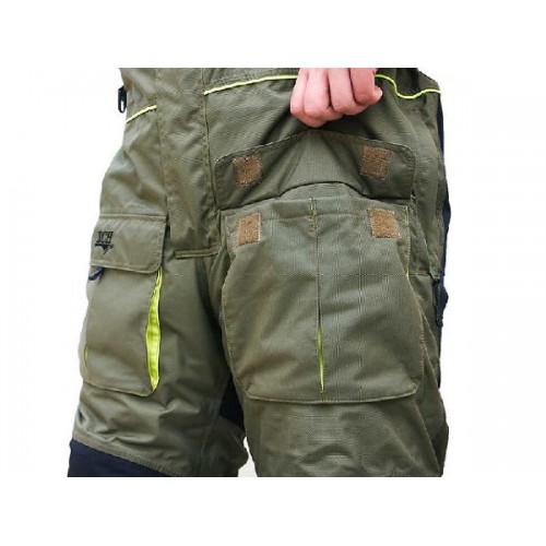 Полукомбинезон с застежкой на молнию с двумя бегунками позволяющими при необходимости расстегивать штаны с низу и притачной верхней планкой. Верхняя планка застегивается на липучку.
