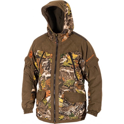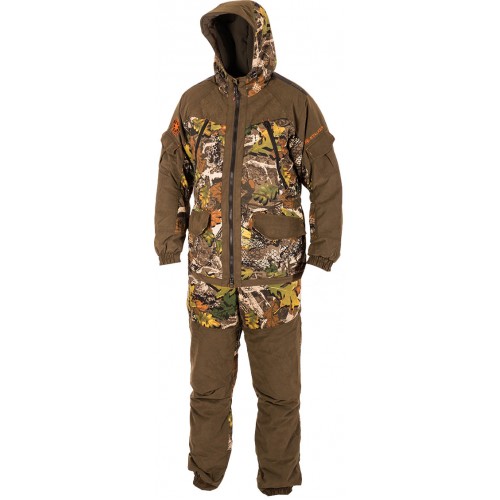 Костюм состоит из куртки и брюк на съемных подтяжках. Отличается специальным анатомическим кроем. Он не стесняет движений. Плечи и зона седалища дополнительно усилены бесшумной мембранной тканью Finland .