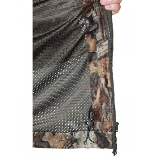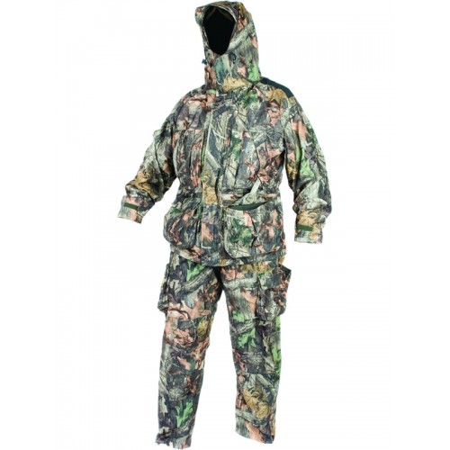 Костюм Huntlandia Camouflage AP, состоящий из куртки и брюк, отлично маскирует благодаря камуфляжной расцветке и пришитой ткани в виде листвы. Мембранная ткань, из которой сшит костюм, отлично защищает от дождя и спасает от перегрева. Подкладка сделана в виде сетки. Куртка с капюшоном, регулирующийся утяжками, и антимоскитной маской, которая при желании отстёгивается. Куртка застёгивается на молнию, закрытой ветрозащитной планкой с фиксацией на липучки. Манжеты рукавов регулируются утяжками с липучками. Два боковых кармана и один нагрудный закрываются на молнию. Низ куртки снабжён вставкой-резинкой, защищающей от ветра и проникновения насекомых. Лёгкие брюки со шлёвками под ремень застёгиваются на кнопку и молнию. Подкладка из сетки - для лучшей вентиляции в жаркую погоду. Брюки с двумя врезными карманами по бокам. Брючины внизу регулируются утяжками. Три варианта расцветки позволят выбрать костюм подходящий для конкретной местности. Костюм сшит из лицензионных тканей, произведенных на Тайване. Основа - водостойкая мембрана Water Wind TEX с высокими показателями: 6500 MVP (паропроницаемость) и 10000 MM H2O (водяной столб). Все швы проклеены. Ткань предотвращает проникновение загрязнений внутрь волокон (например, попавшая на одежду кровь легко смывается простой водой). Наружная ткань костюма не пропускает воду в виде дождя и тающего снега.