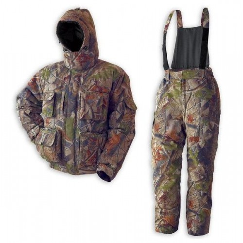 Костюм для охоты, утепленный поларфлисом, состоит из укороченной куртки и брюк с регулируемыми лямками и съемной спинкой. Четырнадцать внешних и три внутренних кармана помогут взять с собой все необходимое. Двойная планка защищает молнию. Костюм обладает водоотталкивающими свойствами и не препятствует проникновению воздуха. Нижняя температура - 20