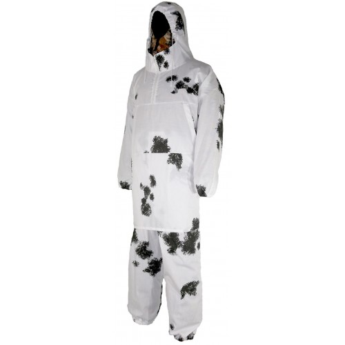 Маскировочный костюм «Метель» одевается поверх тёплой одежды и предназначен для зимней охоты. В этом костюме легко замаскироваться в зимнем лесу и на заснеженном поле. Костюм состоит из куртки «анорак» и брюк. Изготавливается из бязи с водоотталкивающей пропиткой и ацетатного шелка, ткань не шуршит. В солнечный день костюм не будет бликовать и благодаря камуфляжной окраске поможет вам максимально замаскироваться. Куртка костюма застёгивается на молнию, так же есть прорези, для быстрого доступа к карманам одежды. Голову охотника защищает стягиваемый капюшон с фиксатором. В пояс и низ брюк вшита надёжная резинка. В этом костюме вы не будете цепляться за вертки.