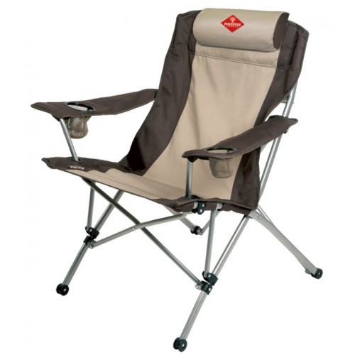 Складное кресло с прочным стальным каркасом выдерживает вес до 110 кг. Сидение и спинка выполнены из плотного полиэстера с влагонепроницаемым покрытием. Модель снабжена подголовником, который при необходимости снимается. В подлокотниках расположены подстаканники. На ножках креслах пластиковые вставки, которые амортизируют вес и равномерно распределяют нагрузку на каркас кресла.