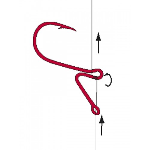Крючок для дроп шот должен находиться в горизонтальном положении, острием вверх. Хорошим вариантом будет использование офсетного крючка, благодаря его изгибу приманка удобнее насаживается и надежно удерживается. К основной леске крючок привязывается узлом Паломар. Существуют и специальные крючки для оснастки дроп шот. Такие крючки имеют загиб особой формы, а ушко служит опорой для удержания жала в нужном положении.
