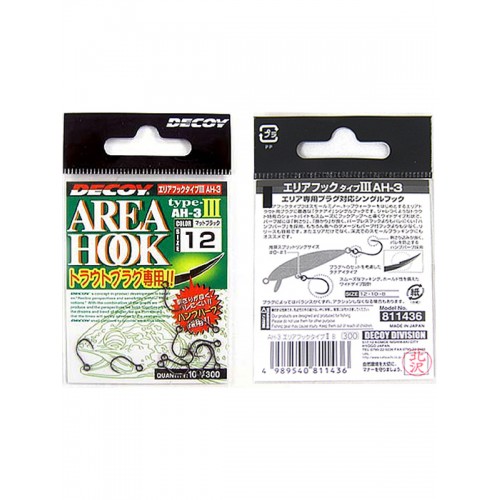 Decoy Area Hook Type 3 – одинарный крючок, предназначенный для оснащения воблеров, прежде всего рассчитанных на форелевую рыбалку в коммерческих водоемах, но отлично зарекомендовавший себя и по разнообразному «белому» хищнику, диким лососевым, ну и, конечно же – по вездесущему окуню. Несмотря на малые размеры (выпускается этот крючок в №№ 12-10-8), Hook Type III изготавливается из достаточно толстой проволоки, что позволяет надежно удерживать рыбу. Кроме того, стоит обратить внимание на бородку Hump Barb, которая, предотвращая сходы рыбы, позволяет освобождать трофей, не травмируя его.