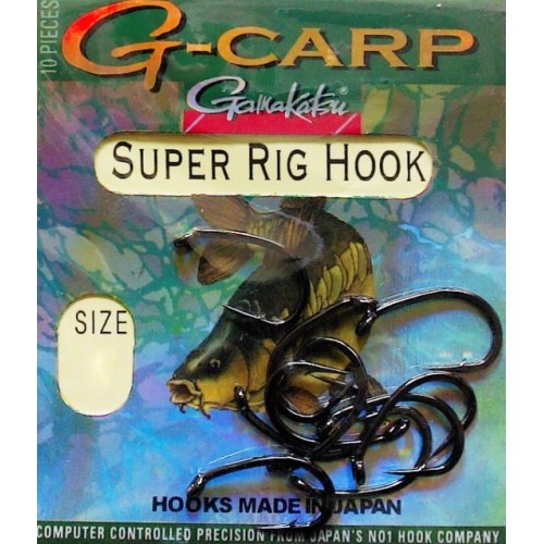 Крючок карповый GAMAKATSU G-CARP серии Super Rig Hook с черным хоромовым покрытием. Крючки формы «Super Rig» предназначены в основном для применения в составе специализированных волосяных оснасток для ловли на плавающие приманки в первую очередь там , где необходимо выделение кормовой частицы при ловле рыбы трофейного размера в сложных условиях . Могут быть применены в монтажах с постановкой насадки на крючке непосредственно и допускают применение монофилов в некоторых ситуациях , когда это необходимо , имея подгиб ушка внутрь . Применимы в стоячей воде и на течении . Не имеют бокового отгиба , а прямое жало направлено внутрь , что позволяет применять крючки данной формы и для классических монтажей на сильно захламлённых участках дна в том числе . Кованая толстая проволока обеспечивает крючкам очень высокий запас мощности.