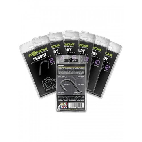 Korda Choddy – крючок гибридной формы с ультра острым изогнутым жалом и микробородкой. Эта модель объединяет в себе широкий поддев с плоским кованым цевьем средней величины. С вывернутым наружу ушком. Это позволяет монтировать мощные монтажи с применением более крепкого нейлона и флуорокарбона.