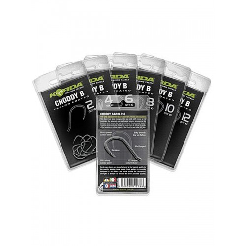 Korda Choddy Barbless – крючок гибридной формы с ультра острым изогнутым жалом, но без бородки и с увеличенным диаметром проволоки. Эта модель объединяет в себе широкий поддев с плоским кованым цевьем средней величины. С вывернутым наружу ушком. Это позволяет монтировать мощные монтажи с применением более крепкого нейлона и флуорокарбона.
