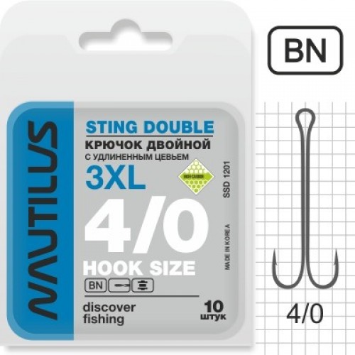 Крючок двойной Nautilus Sting 3XL SSD 1201 - двойной крючок из кованой проволоки. Основной особенностью крючка является экстремально удлиненное цевье 3XL. Двойники с таким цевьем пользуются популярностью у спиннингистов, использующих данную модель для оснащения различных мягких приманок, включая поролоновые рыбки.
