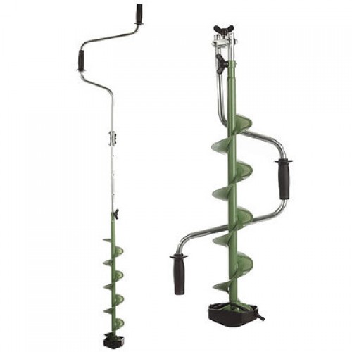 Рукоятка удерживается в рабочем положении 2 винтами. Ее высоту можно менять, так что ледобур подходит для людей разного роста. В местах захвата расположены накладки со стопорами по нижнему краю. Такая конструкция не дает рукам соскользнуть и позволяет с удобством использовать инструмент при любой температуре. Благодаря остроте лезвий, ледобур подойдет для людей с разным уровнем физподготовки. Модель весит 2,6 кг. В сложенном виде ее длина не превышает 85 см. Для транспортировки ледобура в комплекте прилагается защитная накладка на лезвия и прозрачный чехол.