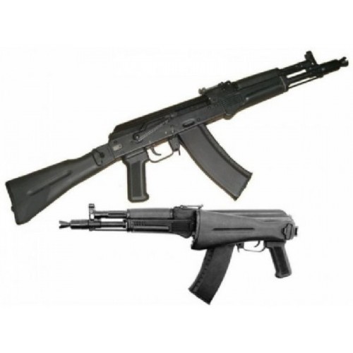 Макет автомата АК 105 предназначен для использования в качестве сувенира, сценического имущества, выставочного образца-имитатора, технологического образца-имитатора, учебного пособия. Модификация ММГ АК-105 исп.12 пластмасса без планки под патрон 5,45х 39 мм. Приклад складывающийся, антабка закреплена на утончении. Пластмассовая пистолетная рукоятка рифленая, на цевье нанесены глубокие насечки и большое скругленное утолщение для удобства держания.