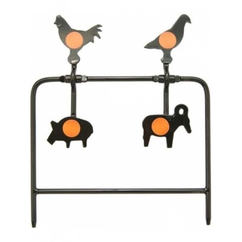 От малой модели отличается увеличенным размером и дополнительной парой горизонтальных мишеней на планке. Мишень для пневматики Gamo - искусственная цель для развлекательной стрельбы на открытом воздухе. Дачный отдых или пикник можно отлично разнообразить коллективной стрельбой из пневматического оружия. Изделие не требует сборки и инструмента для сборки, быстро и легко устанавливается. В нижней части прутья рамы мишени заострены для установки в грунт. Представляет собой прочную стальную раму, на которой на шарнирах размещены стальные силуэты зверей и птиц (кабана, барана, петуха и голубя). Устройство возвращается в исходное положение после попадания пули, поэтому Вам не надо заниматься сменой мишеней. В центр каждого силуэта нанесен самоклеющийся стикер (наклейка) оранжевого цвета круглой формы. Стойкое антикоррозионное покрытие позволяет использовать мишень в неблагоприятных погодных условиях. Для того, чтобы разнообразить стрельбу по мишени производитель укомплектовал её надувными цветными шариками.