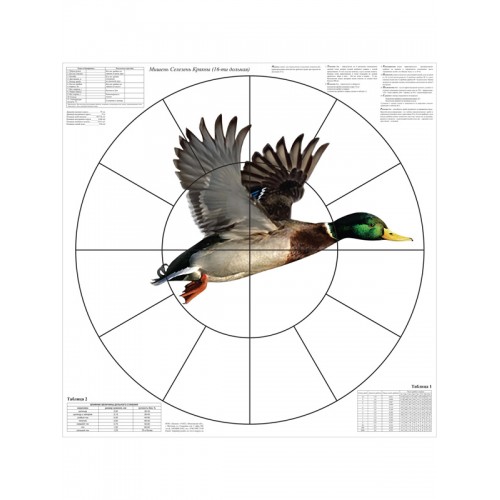 Мишень для пристрелки дробовых ружей с изображением селезня, разделенная на 16 долей, изготовлена из высококачественной бумаги. Мишень служит для определения показателей, характеризующих качество боя дробового ружья при стрельбе на дистанцию 35 метров. При стрельбе по мишеням можно определить следующие характеристики: точность боя, кучность боя, равномерность осыпи, сгущение к центру и постоянность боя.
