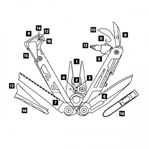 На этом функциональность мультитула не заканчивается. Реально у человека в руке 19 инструментов: молоток, сменные кусачки особой прочности из стали 154CM, универсальный нож (одна половина прямая, а вот вторая получила волнообразную заточку). Острый стальной клинок 420HC с выемкой для удобного открывания одним пальцем. Главный инструмент – универсальный пассатижи, они же кусачки и острогубцы, есть держатели для бит, алмазный надфиль, набор отверток и пила.