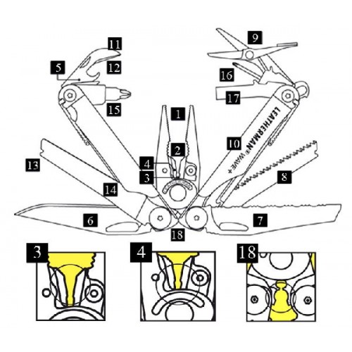 Мультитул Leatherman Wave Plus пригодится при различных видах работ. Содержит 17 инструментов, включая острогубцы, пассатижи, кусачки, нож, напильник и т.д. Все детали фиксируются, что предотвращает случайное закрытие или выпадание. Для более удобной переноски мультитула предусмотрен надежный нейлоновый чехол. Длина изделия в сложенном состоянии - 10 см. Все опции фиксируются от случайного закрытия или выпадания.