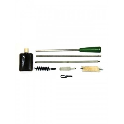 В комплект входят: разборный шомпол, вишер и три ерша: щетинистый, спиральный и пуховка для нанесения масла. Шомпол разборный металлический 3-х коленный с пластиковой ручкой. Служит для чистки канала ствола после стрельбы, смазывания канала ствола после чистки, удаления ржавчины, появившейся на поверхности канала ствола, освинцовки. Ерш металлический спиральный предназначен для очистки канала ствола от появившейся ржавчины и освинцовки. Ерш охотничий щетинный пластиковый. Щетинной щеткой чистят канал ствола и наносят на него смазку - нейтральное ружейное масло. Вишер петлевой - в него пропускают кусок ветоши или тряпки, чтобы снять остатки масла со стенок канала ствола. Пуховка удобна при промывке стволов горячей водой: она играет роль поршня, засасывая в ствол налитую в таз жидкость. Применять пуховку для нанесения смазки на каналы стволов, как это часто рекомендуют, можно, однако после этого в них остается много волокон. Флакон п/э под масло. В масленке хранят нейтральное ружейное масло. Упаковка - пластиковый футляр.