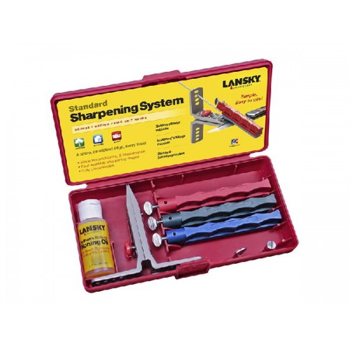 Lansky Standard серии LKC003 - это прекрасный наборчик, который поможет вам с легкостью заточить инструменты. В комплектации находится: зажимная струбцина - 1 штука, 3 бруска, предназначенных для заточки, 3 брусковые направляющие, специальное масло, улучшающее процесс заточки, два дополняющих винта, а также пенал из пластика в котором вс хранится и транспортируется. Главным предназначением такого набора является обеспечение максимально быстрой, качественной и несложной заточки лезвий ножей ,а также бритв. При заточке инструментов используемыми углами будут: 17, 20, 25, 30 градусов.