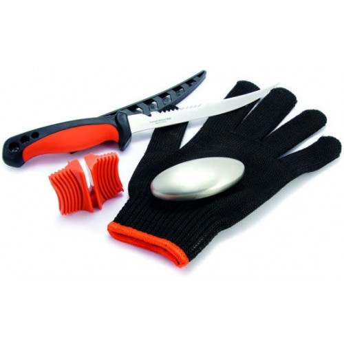 Состоит из филейного ножа с пилкой для позвоночных костей, точилки, перчатки из кевлара, защищающей кисть от порезов и "стального мыла" – специальное приспособление для мойки рук и устранения неприятного устойчивого запаха рыбы. В комплекте нож, точилка, перчатка, "стальное мыло".