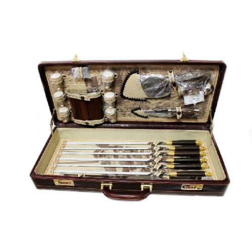 | Дополнительная информация: | комплект: 1. Мангал. 2. Шампура (литьё) (общ. дл. 580 мм) - 6 штук. 3. Рюмки - 6 штук. 4. Топорик разделочный. 5. Нож разделочный. 6. Фляжка 0,5 литров. 7. Заж. 8. Нож складной 9. Кейс. |