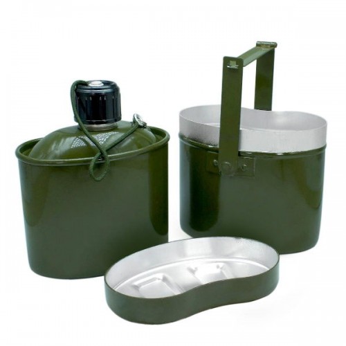 Котелок и фляжка, выполненные в армейском стиле, предназначены для использования в полевых условиях. Котелок подходит для разогрева или приготовления горячей пищи. Благодаря ровному днищу фляжки, в ней можно вскипятить воду как на горелке, так и на плитке, предварительно открутив пробку.