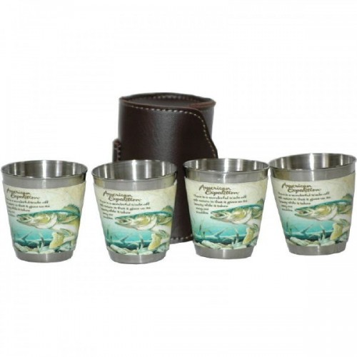 Рюмки выполнены из нержавеющей пищевой стали, они прочны и удобны, а чехол из кожи дополнительно защитит их от грязи и повреждений. В комплектацию входят 4 рюмки с изображением рыбы.