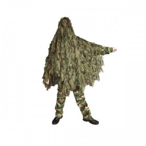 Накидка Лесовик предназначена для визуального размывания контуров человека с целью маскировки летом, накидывается поверх головы, закрывая все тело до линии чуть выше колен. По всей поверхности накидки размещены объемные «листочки» из полос материала, имеется прорезь для глаз, за счет ластичной тесьмы плотно крепится на голове, на спине накладной карман-сумка на молнии, который можно использовать как карман и как мешок для упаковки накидки