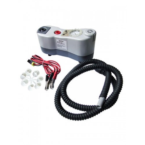 Электрическая помпа для лодок до 6 м с питанием 12V, регулятором давления до 1000 мБар и встроенным манометром. Насос оснащен двумя ступенями с производительностью 160 и 450 л/мин и разъемами на клеммы аккумулятора. Комплектуется набором переходников и сумкой для переноски.