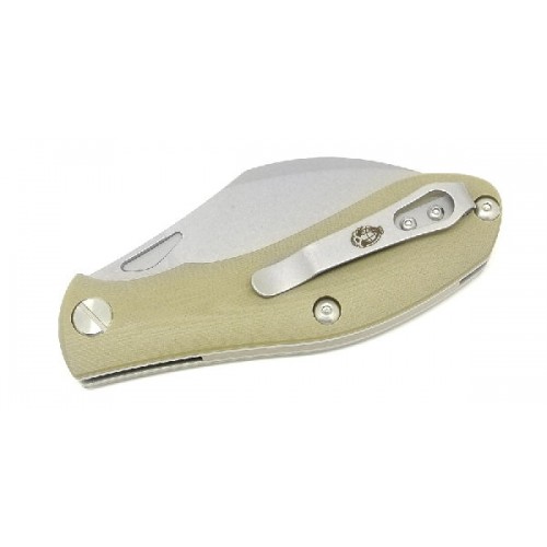 Клинок ножа изготовлен из инструментальной стали D2 и имеет уверенную твердость на уровне 58-60 единиц по шкале Роквела. Необходимо помнить, что сталь D2 является коррозионностойкой, но не нержавеющей и после использования нож нужно промыть и просушить. Клинок имеет прямые спуски от обуха и превосходно режет. На обухе ножа вы можете увидеть прогиб, в который можно упереться большим пальцем при силовом резе или при необходимости более четкой фиксации ножа в руке при точных работах.