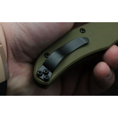 - Рукоять облегчённая с накладками из зелёного G10 , позволяет длительное время комфортно работать ножом;
