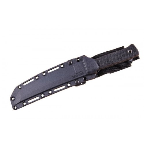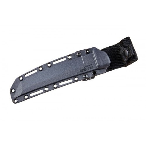 Ножны выполнены из пластика и прекрасно перенесут любые условия. Они имеют несколько вариантов крепления – петлю для ношения на поясе, продолговатые прорези для дополнительных ремней и круглые отверстия для шнура. Нож надежно удерживается в ножнах при помощи ремешка с клепкой.