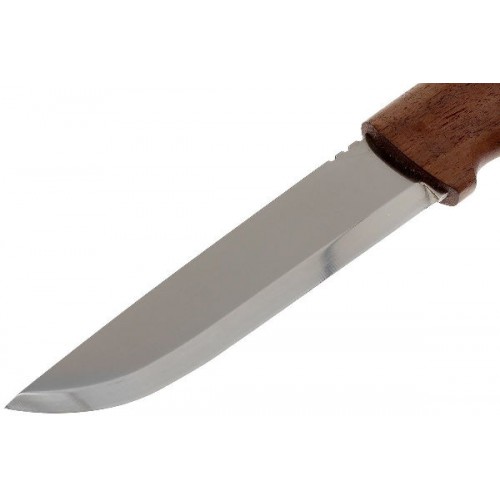 Клинок ножа формы Drop Point с небольшим понижением линии обуха к острию и с прямыми скандинавскими спусками - универсальными и одинаково удобными при самых различных работах.