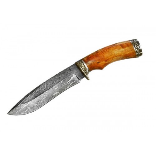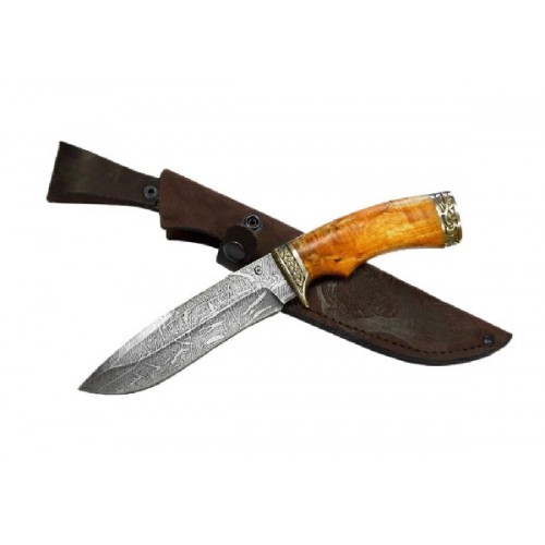 Нож «Скиф» весьма напоминает скифский меч акинак, однако меньшая длина лезвия не дает права отнести его к холодному оружию. Лезвие изготовлено из дамасской стали и превосходит другие клинки по своим качественным характеристикам. Прочный, стойкий к ударам и гибкий, устойчивый к коррозии клинок, имеющий при этом строгий без излишеств декор - не так уж часто встречающийся оптимальный набор характеристик. Рукоять выполнена из стабилизированной карельской березы, которая отличается повышенной устойчивостью к влаге. Стабилизированная древесина сохраняет внешний вид в процессе интенсивной эксплуатации, не выгорает, не выцветает, не взаимодействует с техническими маслами и активными химическими растворителями и даже выдерживает воздействие открытого огня. Этот оригинальный нож с гардой и тыльником, украшенными мельхиоровым литьем с узорами, станет приятным в эксплуатации, незаменимым и крайне удобным походным инструментом.